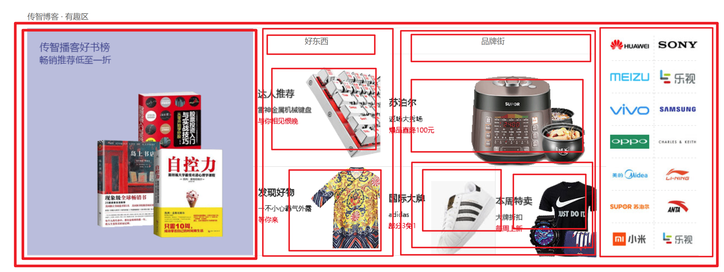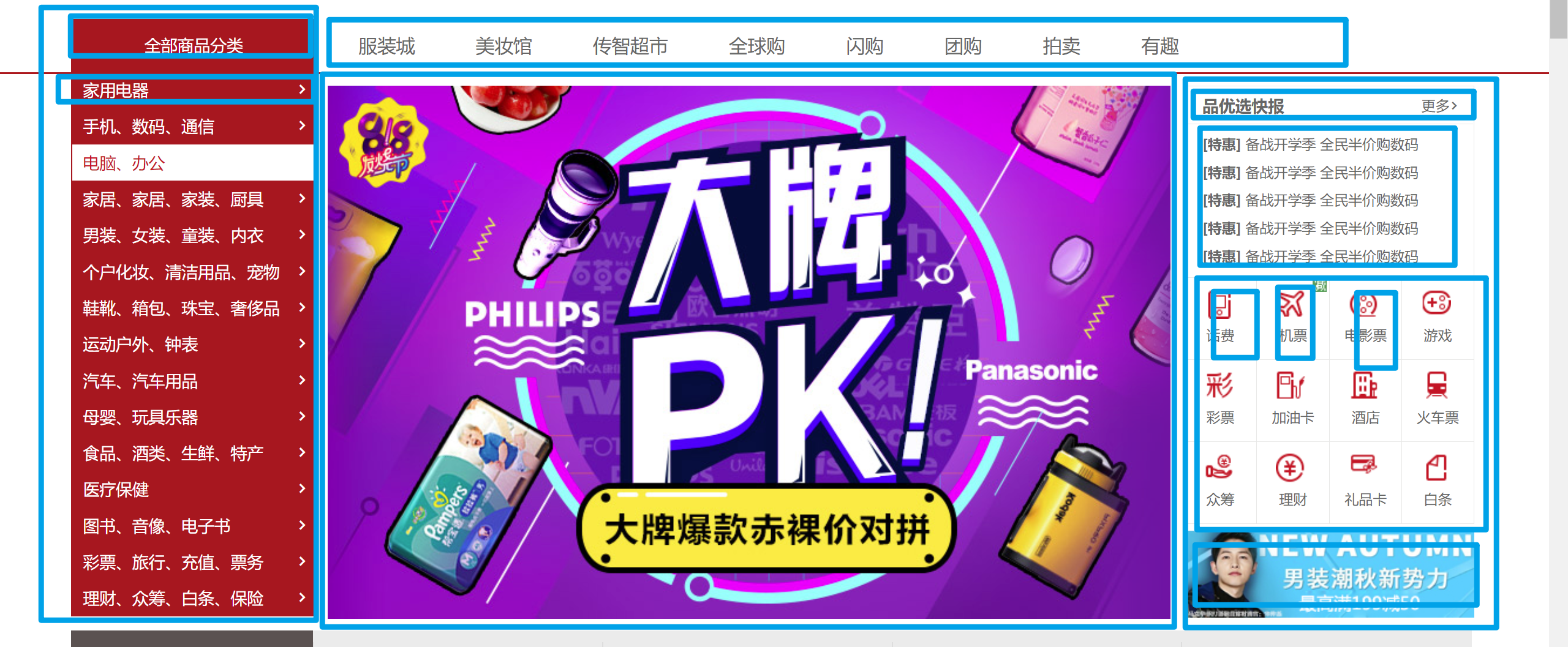 上面的全部商品分类和下面的家用电器等,其实是一个大盒子。旁边的服装城导航栏都是属于头部最底部的部分的。红色横线给头部header添加一个下边框。中的广告图。还有一种布局就是,服装城和全部物品分类写到头部的最底部的盒子里,下面的家用电器写到banner里面就可以了,如果写到banner里就不要添加外边距了,盒子就会贴着最上面。中间的banner图,向右浮动就可以了,或者写一个大盒子,最左边的盒子向右浮动,就可以完成布局,话费机票等图标使用精灵图就可以,使用伪元素添加进去。