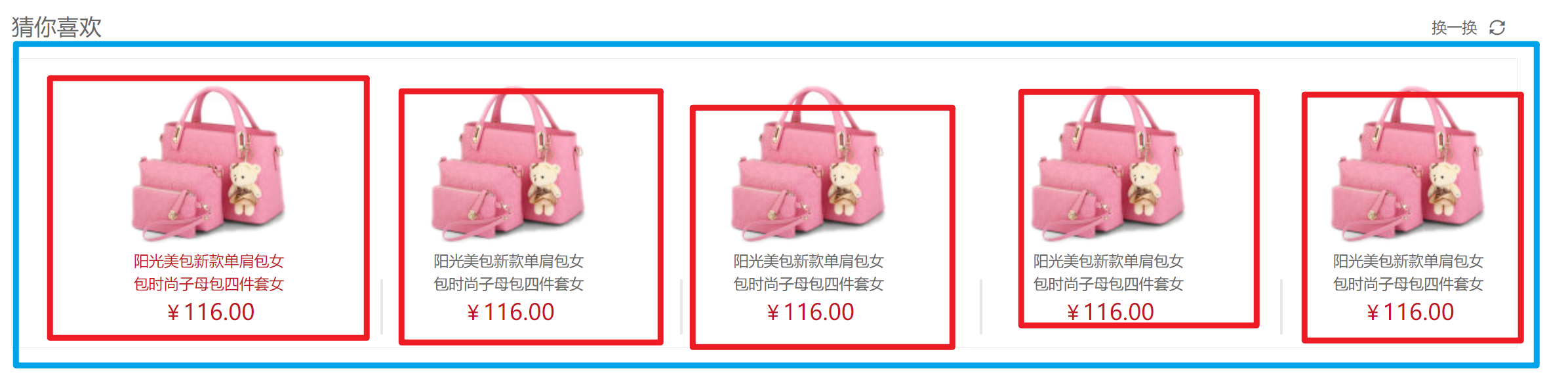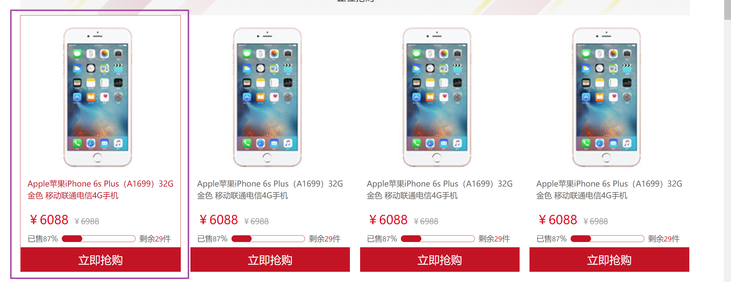 一个盒子里有很多小盒子,使用ul>li,一个大的盒子里面包含三个盒子,图片和标题是可以点击跳转的放在一个div里,价格和进度条是一个盒子,抢购按钮是一个盒子。注意鼠标悬浮到商品上有红色边框,需要给大盒子预先添加一个透明的边框,可以解决当鼠标悬浮时添加外边框是盒子出现抖动的问题。