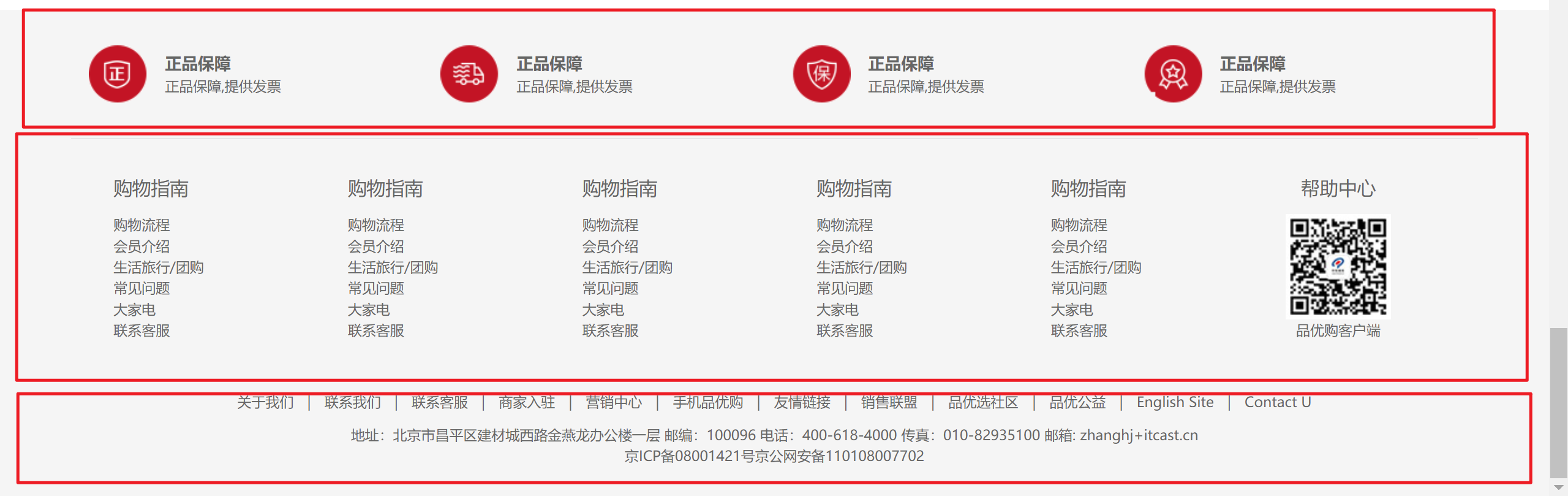 同样是一个大盒子里有三个子盒子,不过三个子盒子使用依次向下正常的标准流。使用小li或者div>div也是可以的。中间的盒子需要用到自定义列表了,也就是dl>dt/dd,给浮动,内外边距。最底部内容居中。