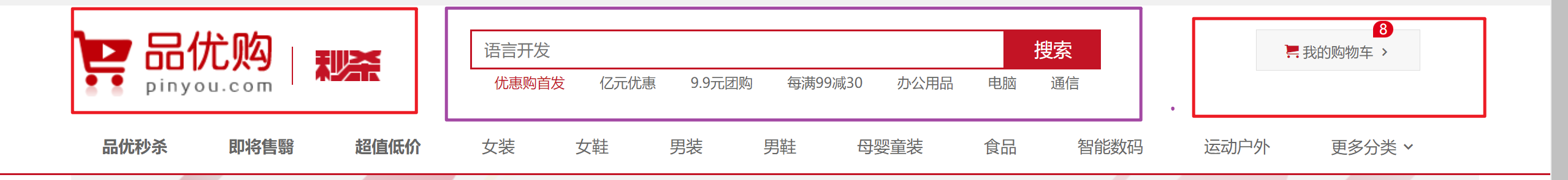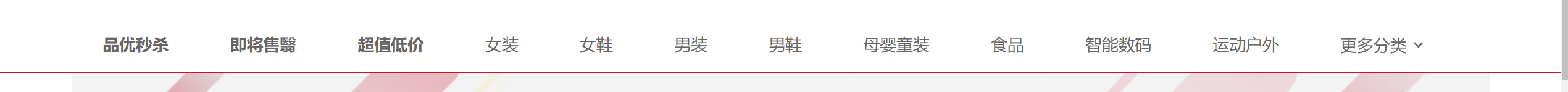 这个和上面有稍微一点改变,logo旁边加了一个分割线和一秒杀logo,因为主页面使用的浮动来完成的,如果在这个大的logo盒子里面加一个秒杀logo的盒子,会增加大盒子的宽度,从而导致后面的浮动出现问题,我们只需要在搜索栏这个盒子缩小外边距就可以解决,中间的分割线在logo盒子使用伪元素来添加即可。红色分割线只需要在大盒子添加下边框即可
