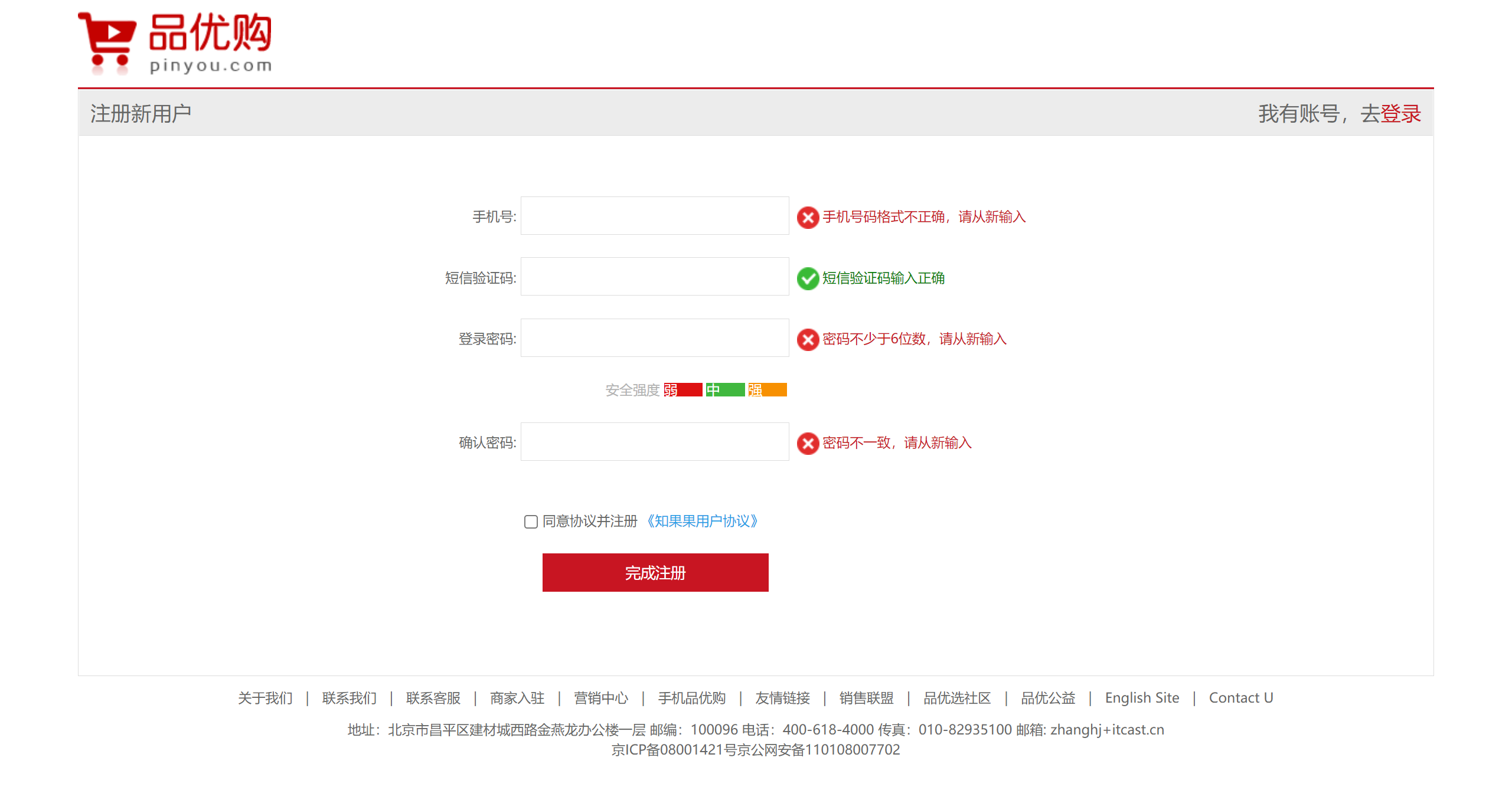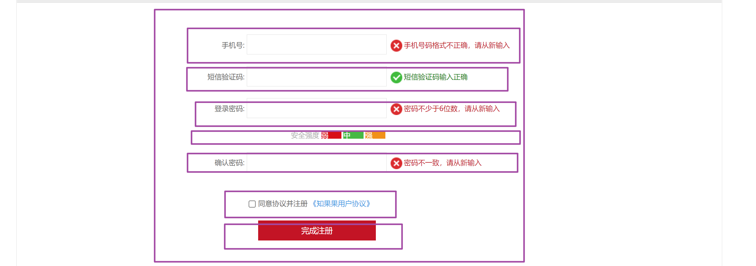 大盒子水平居中,使用ui>li来排列每个输入项,label需要文本内容向左对齐,不然会导致格式显示出现问题,同时需要转为行内块元素才可以正常显示。安全强度,三项就是三个盒子添加背景颜色和字体即可。每个输入项都有两个盒子,手机号格式不正常,使用span添加图标即可。