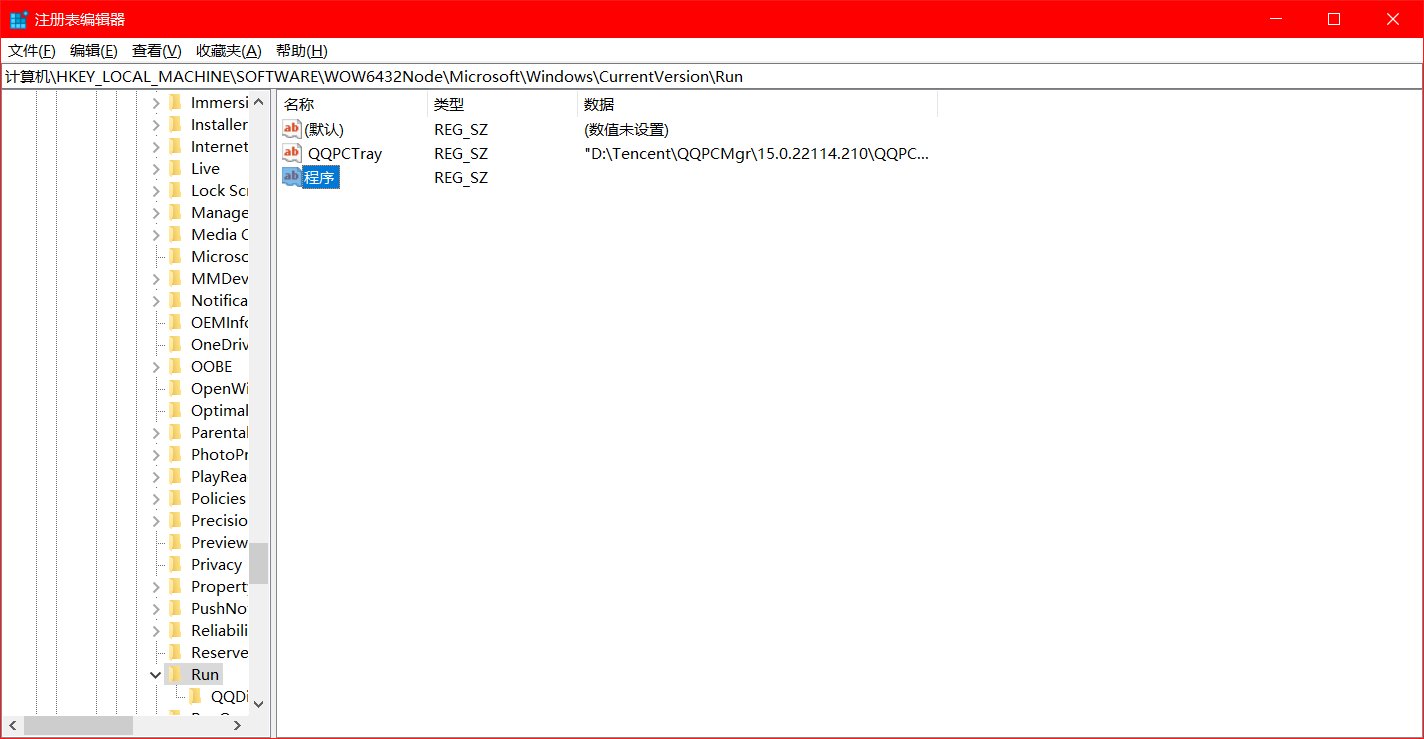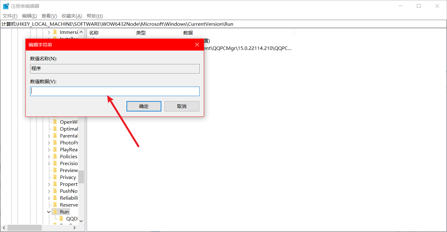 新建好了之后,右键新建的项,然后修改,会出现下列框框,在填入启动项路径如(H:\12\123\程序名.exe)
