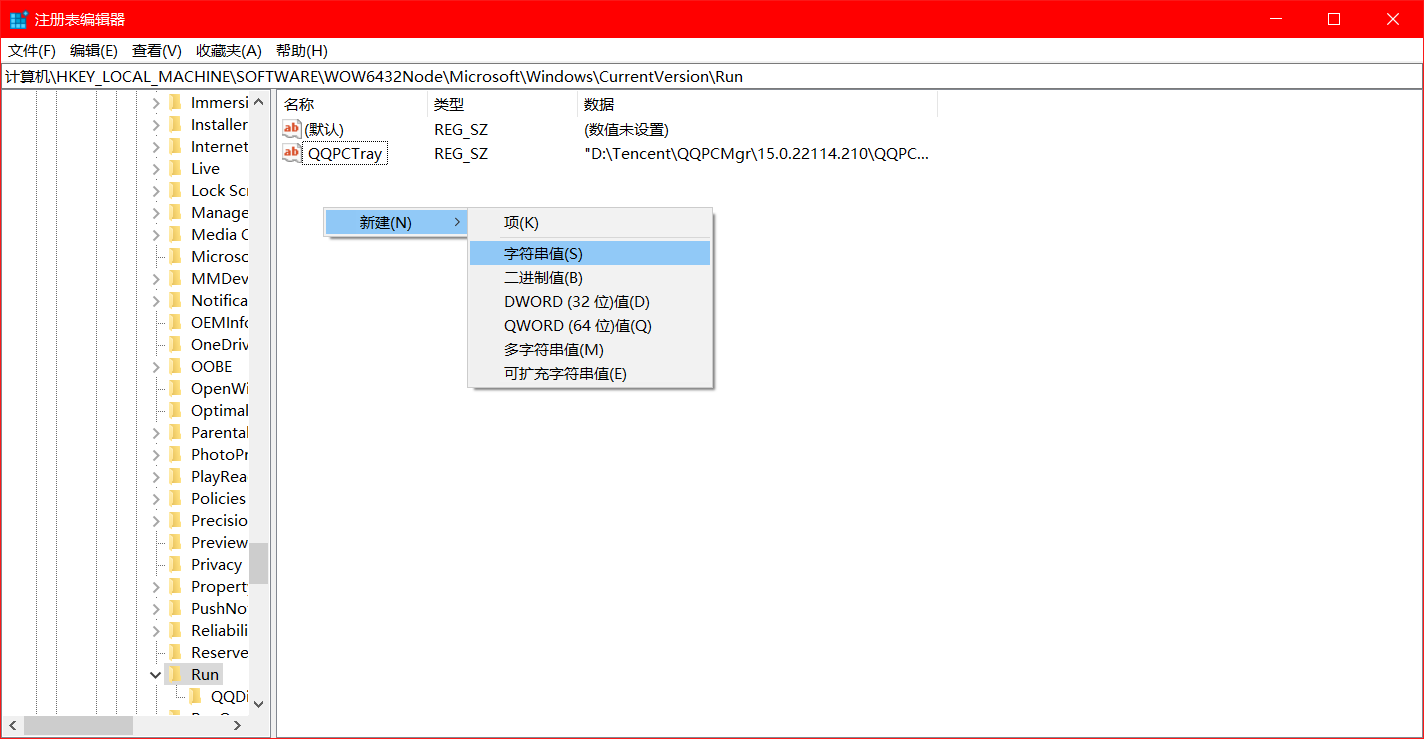 右键新建字符串值 名称随便改(最好改成启动项名称 方便辨识)