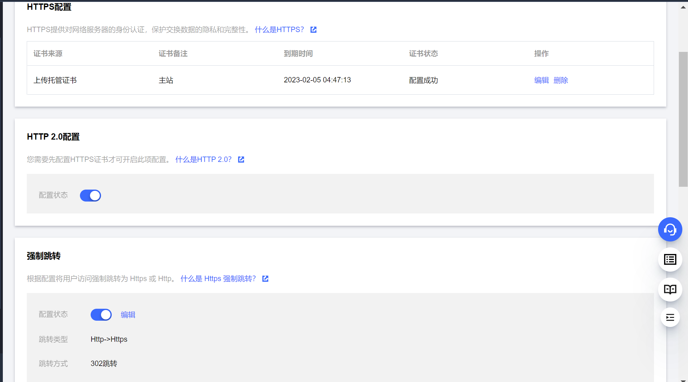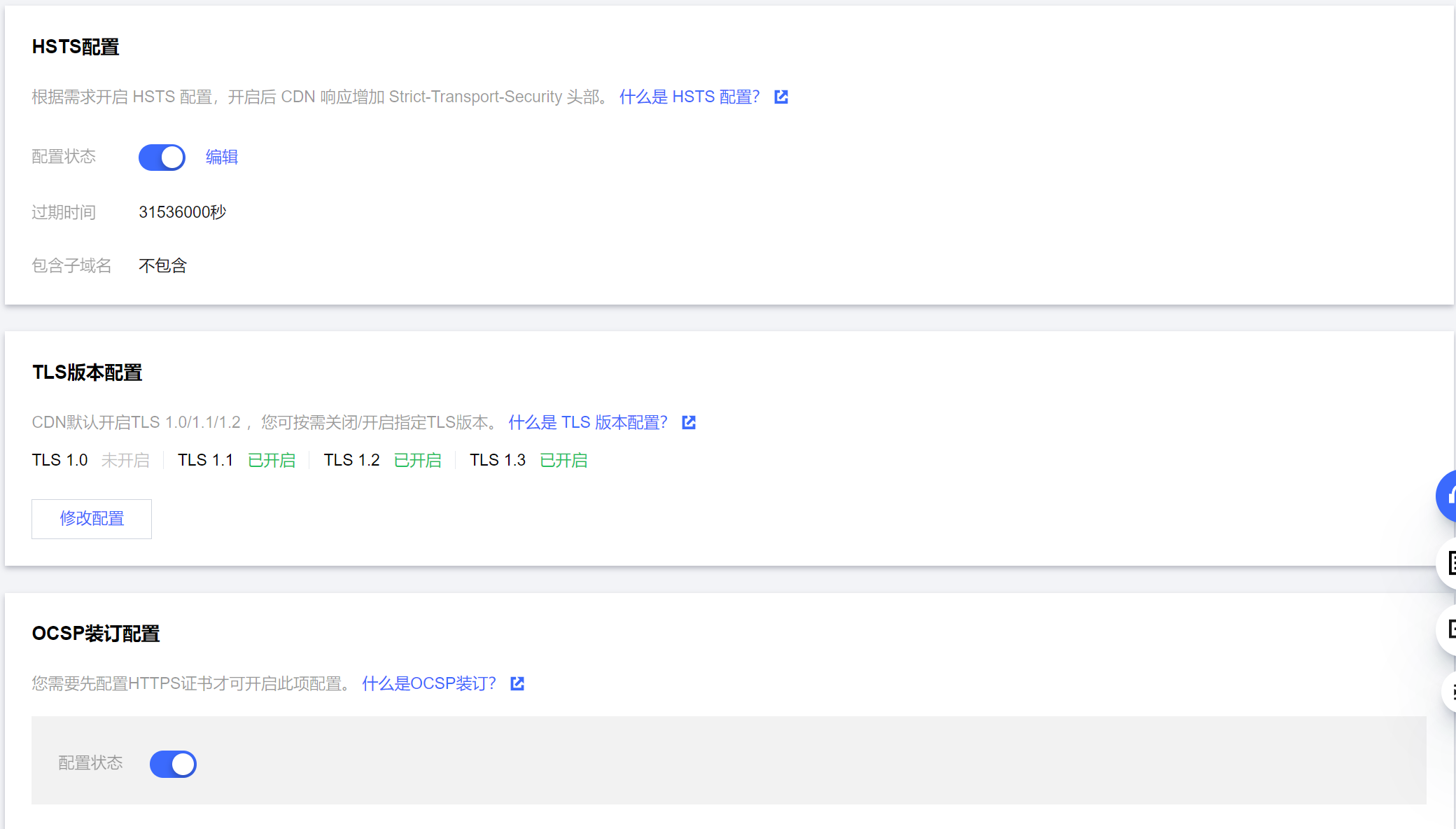 HTPPS证书可以用自己和腾讯云申请的。配置玩后开启下面的设置,这里的TLS版本一定关掉TLS1.0,这样会更安全一点。