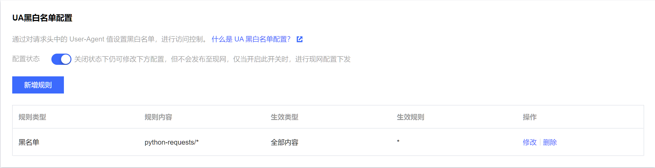 在访问控制里找到IP访问限频配置。限制每秒的访问次数。python-requests/*